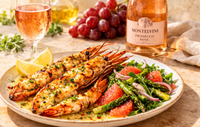 Grillowane langustynki z masłem czosnkowym i sałatką ze szpragów i grapefruita podane z Redentore Prosecco Millesimato, NV, DOC Treviso, Włochy