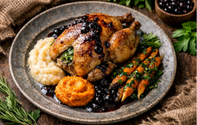 Pierś z kaczki à l’orange konfitowany fenkuł, ziemniaki pieczone z masłem i świeżym tymiankiem