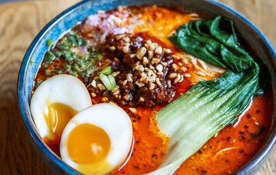 - tantamen - makaron ramen/ tantan tare/ ostre mięso mielone/ olej chilli/ orzechy/ szczypior/ czerwona cebulka/ jajko