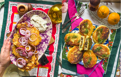 - Batatowe latkes z ziołowym twarogiem z tahiną, granatem i oliwą