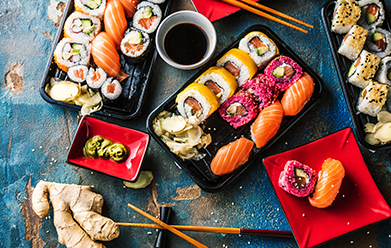WYKORZYSTANE SKŁADNIKI: łosoś, tuńczyk, krewetki, awokado, paluszki krabowe, kampyo, oshinko, ogórek, wodorosty, sałata, jarmuż, ryż, sezam, imbir marynowany, ocet, tempura, chrzan wasabi, sos sojowy.